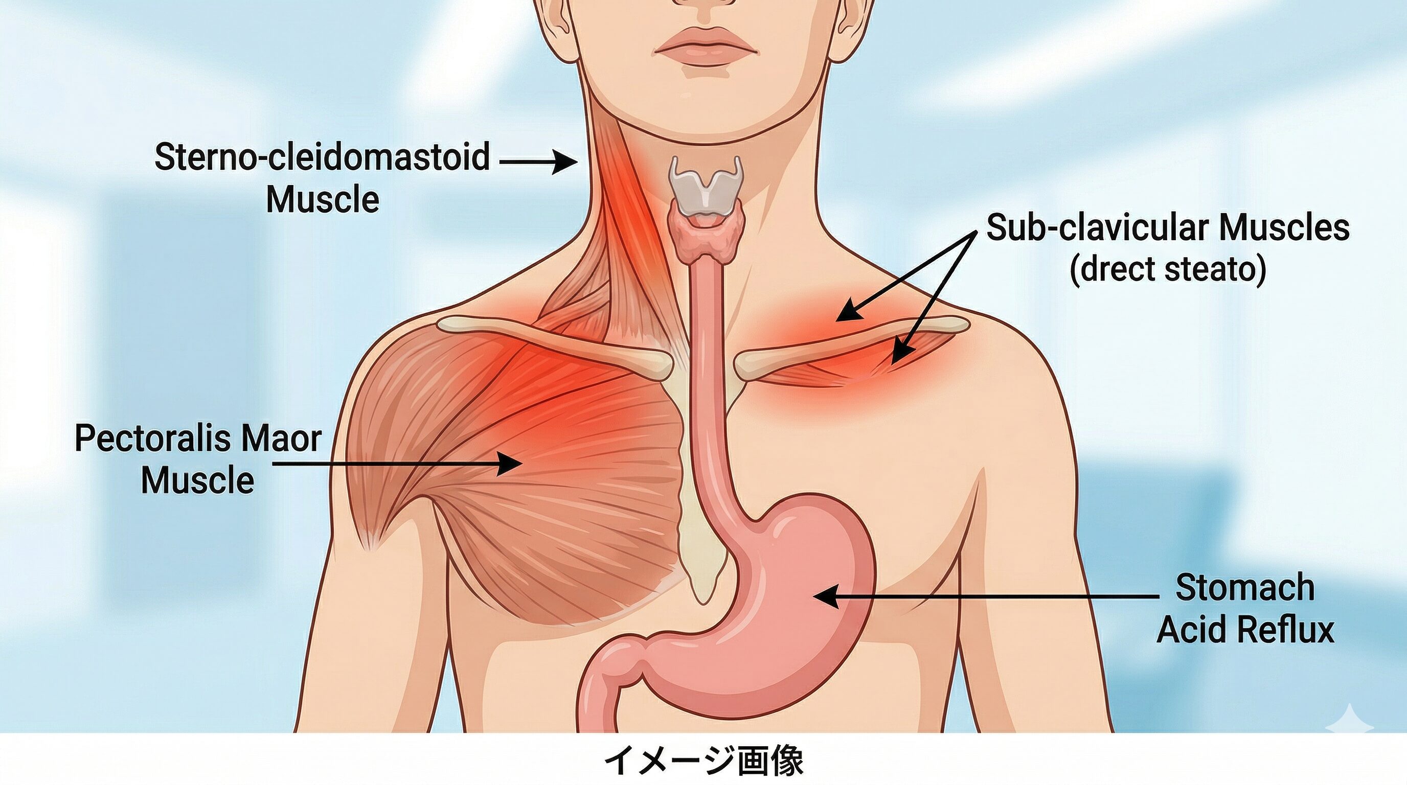 特に逆流性食道炎の場合、喉の粘膜が胃酸で刺激されるため、その防御反応として首の前側(胸鎖乳突筋や広頚筋)や鎖骨の下(鎖骨下筋)がガチガチに硬くなってしまうのです 。